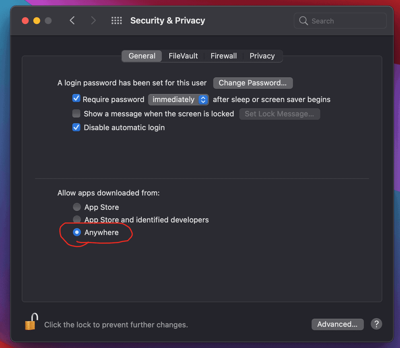 运行该命令后,系统会提示您输入密码,然后会新增一个“任何来源”选项。