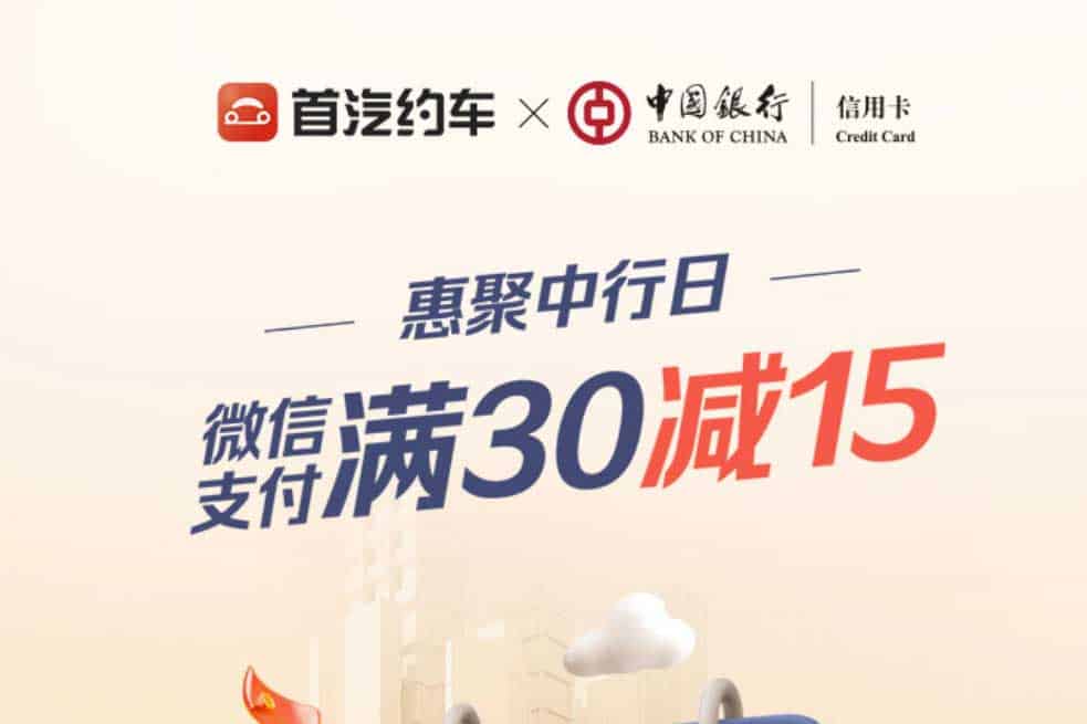 首汽约车与中国银行信用卡合作,推出微信支付立减优惠活动。