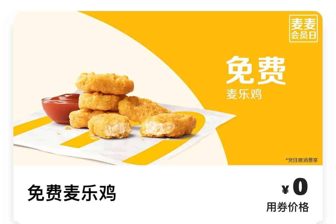 2. 兑换内容为麦乐鸡块(5块),需通过麦当劳微信小程序、官方App或支付宝小程序的到店取餐功能进行消费。